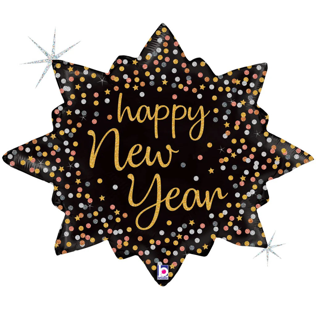 Accent your New Year's themed party with this 32" large unique shape New Year Confetti Burst foil mylar balloon. The perfect balloon for your New Year's party, this 32" Betallic party balloon is great for setting the scene! This balloon includes a self-sealing valve, preventing the gas from escaping after it's inflated. The balloon can be inflated with helium to float or with a balloon air inflator. Balloon arrives uninflated.